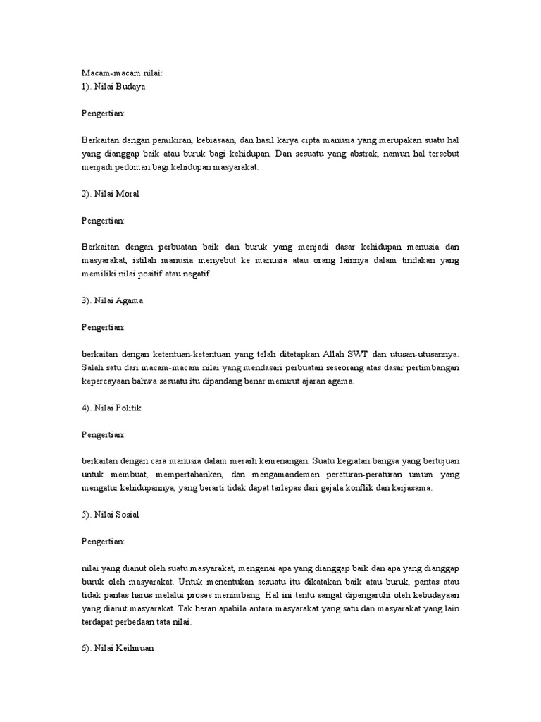 5 Macam Macam Nilai Dan Contohnya Menurut Ahli Dosensosiologi Com